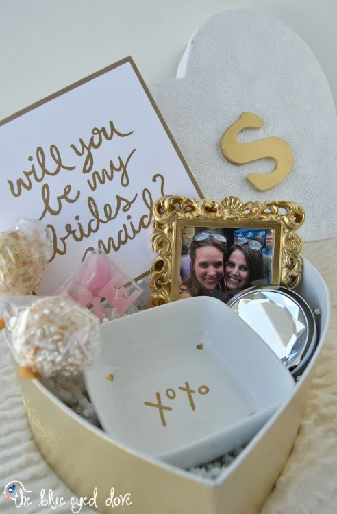 This idea includes a sweet card, "LOVE" candles, cake pops (you can make your own or pick some up at Starbucks), decorative makeup mirror, and a trinket dish. It's the perfect assortment of little treats to make your bridesmaid feel special!